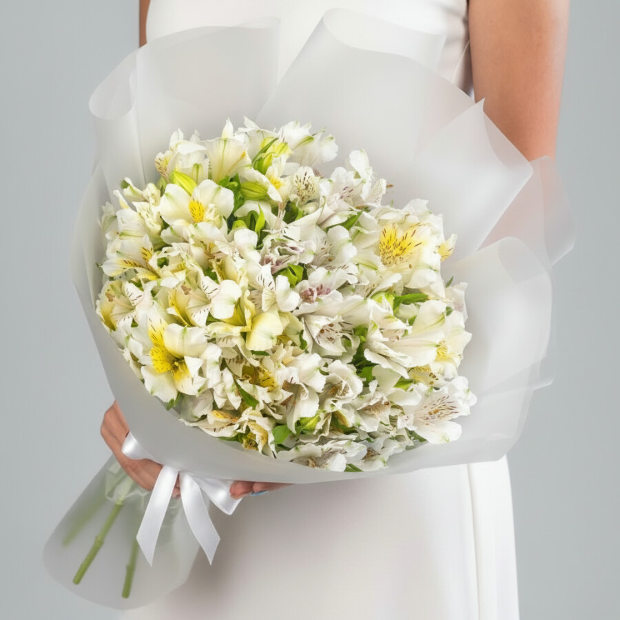 Букет альстромерий — это прекрасный выбор для тех, кто ценит нежность и элегантность в цветочных композициях. В составе букета 15 белых альстромерий, которые подчеркнут вашу нежность и изящество.