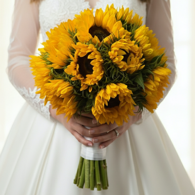 Букет невесты "Подсолнух", как персональное солнце в ваших руках! Девять цветков Подсолнуха Sunrich Orange среднего размера украшены декоративнолиственным вечнозеленым Берграссом. Его тонкие длинные стебли делают композицию утонченной, а молодые веточки древесного растения Салал дополняют мягкостью за счет своих правильных и блестящих кожистых листьев. Размер букета средний в диаметре, примерно 40 см, зона для руки удобно обернута тугой лентой желтого цвета. Форма круглая, вес комфортный. Такой https://megacvet24.ru/bukety/svadebnyye/" target="_blank">свадебный букет несет настроение и непосредственность в образ, отлично смотрится и на контрасте со строгим собранным образом невесты.