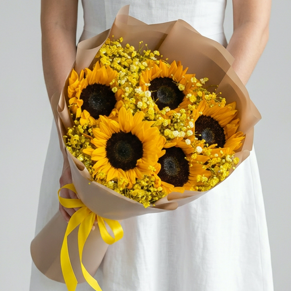Букет "5 Подсолнухов и Гипсофила Желтая"