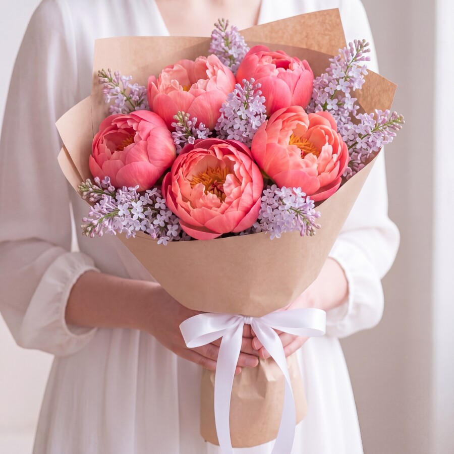Букет "Пионы Корал Сансет и Сиреневая Сирень"