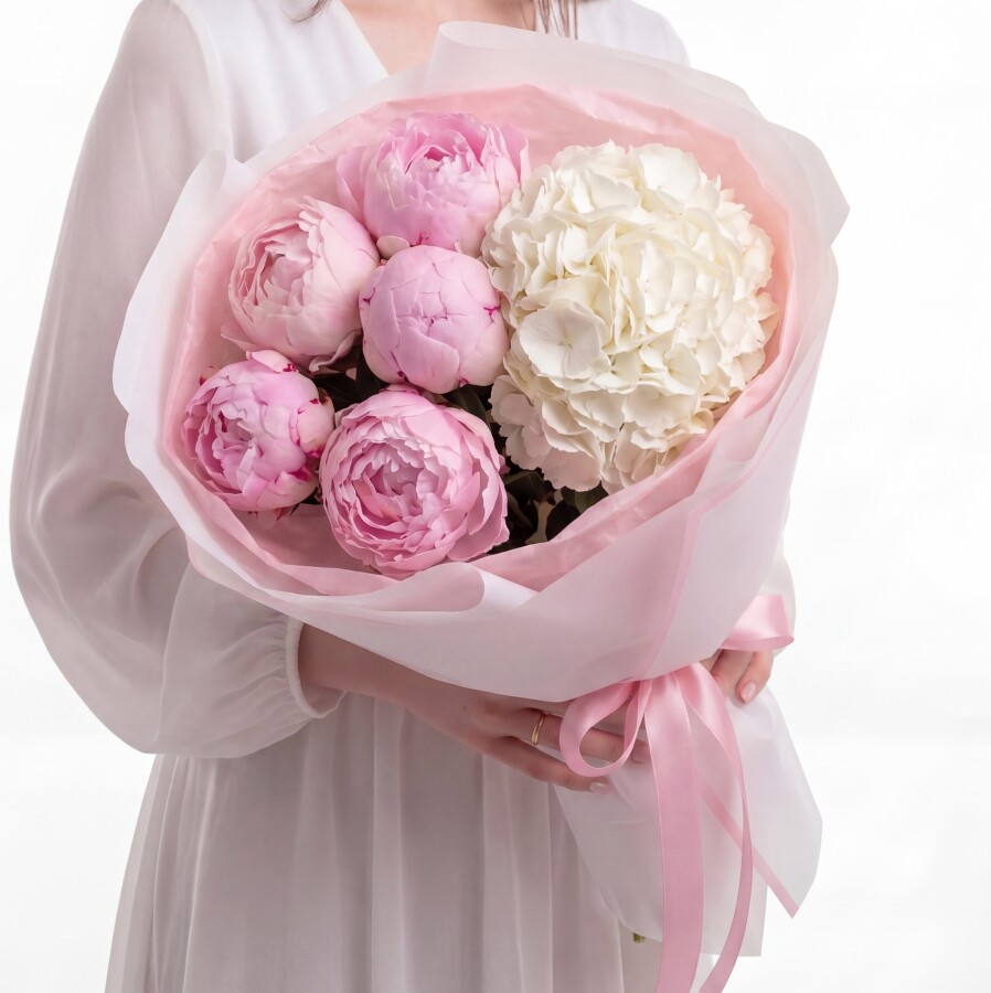 Букет "Пионы Сара Бернар и Гортензия Белая"