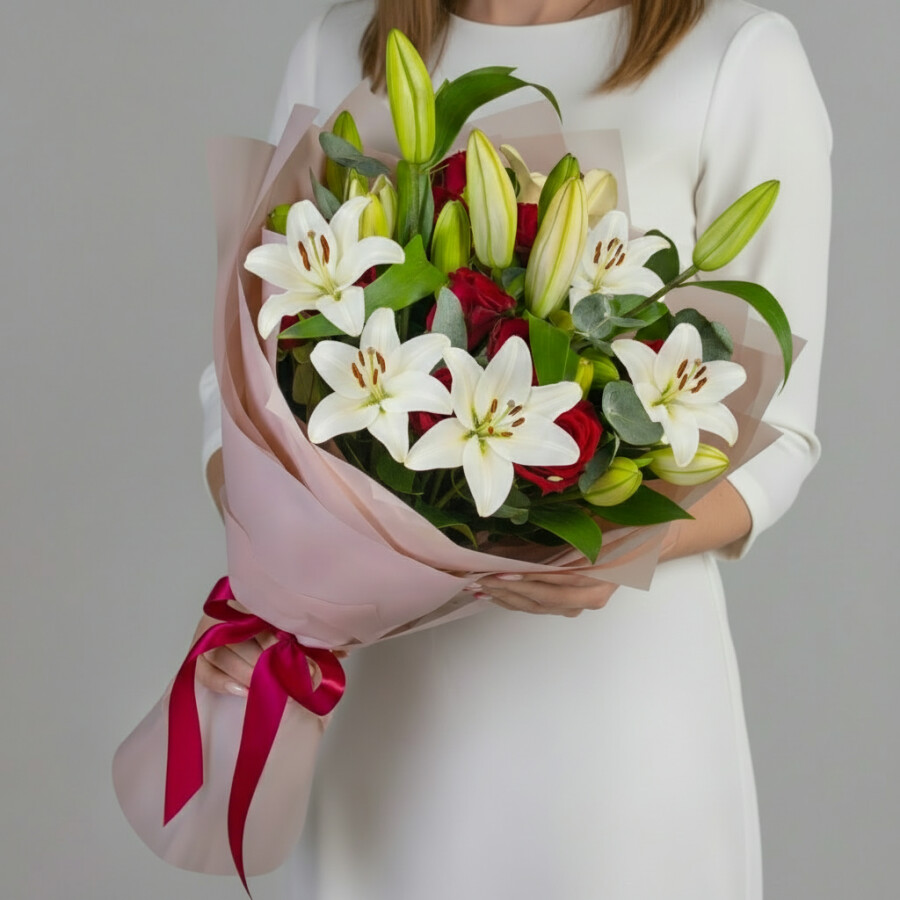 Крупные бутоны цветов наделяют помещение светом и наполняют невероятным уютом. Сочетание белых и красных цветов внушает трогательные чувства и нежные грезы, а так же поселит праздник в вашем сердце.