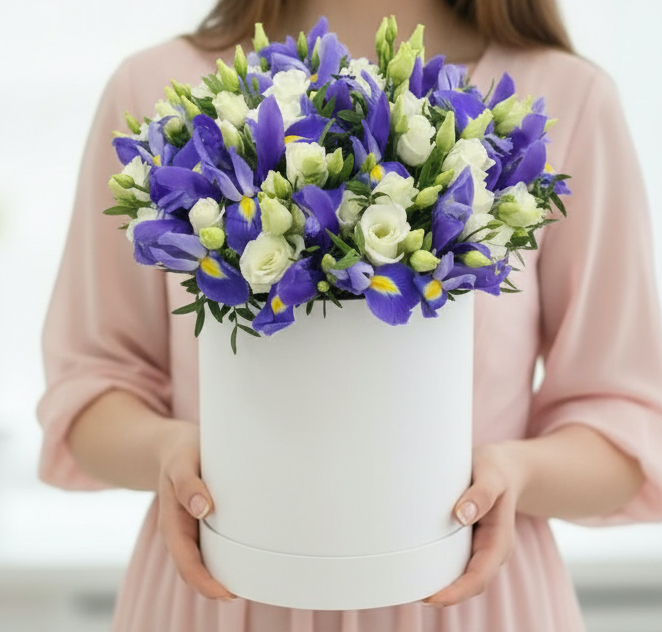 Букет "Белые Эустомы и Ирис" в коробке