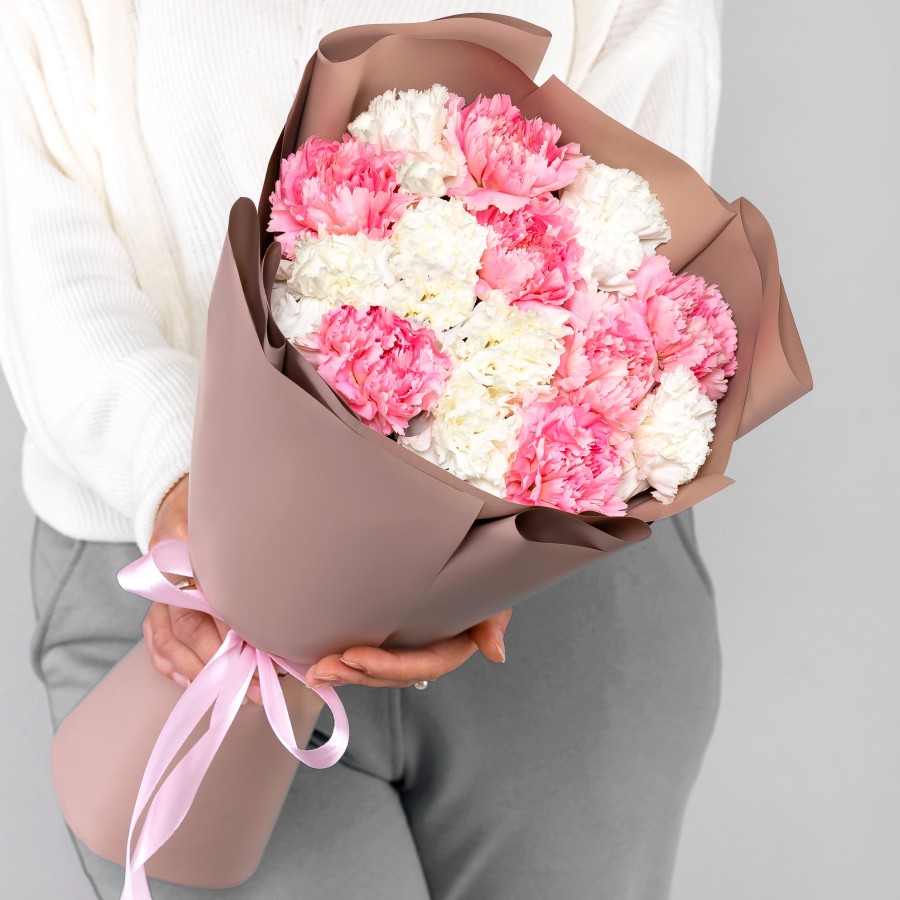 Букет из белых и розовых гвоздик выглядит совершенно великолепно: крупные бутоны яркого розового цвета, расположены полосами перемежаются с белыми цветами. Такая композиция отлично подойдёт в качестве подарка на свадьбу, помолвку, день рождения, супруге, любимой девушке, маме. Выглядит он очень романтично и нежно, обёрнутый в дизайнерскую упаковку и перевязанный розового оттенка атласной лентой. В срезки цветы стоят довольно долго до дести - четырнадцати дней. Мы приложим к ним специальные средства, которые помогут сохранить свежесть цветов до 21 дня, а также инструкцию по уходу за гвоздиками. Аромат цветов нежный, практически незаметный, благодаря чему его можно дарить аллергикам, людям чувствительным к сильному аромату. С латыни название гвоздики переводится как божественный цветок, и в Древнем Риме, Древней Греции его считали воплощением бога Зевса. Их часто высаживали на клумбах возле храмов. Сейчас гвоздики используются для составления как мужских, так и женских композиций.