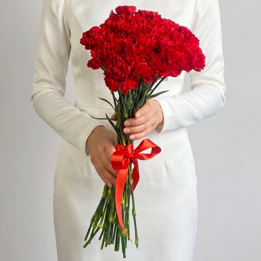 Букет из 25 красных гвоздик на длинных, до 50 см длиной плотных стеблях, перевязанных лентой, смотрится ярко и привлекательно. Красная гвоздика в нашей стране ассоциируется давно и прочно с праздником 9 мая, но подарить такой букет можно не только ветеранам на День Победы. Ещё красная гвоздика обозначает страстную любовь, потому преподнести композицию можно супруге, любимой девушке, признаваясь в любви или делая предложение. Также стоит отметить, что гвоздика давно стала цветком универсальным и его можно, не оборачиваясь на смысловую нагрузку, дарить как мужчинам, так и женщинам по любому поводу.