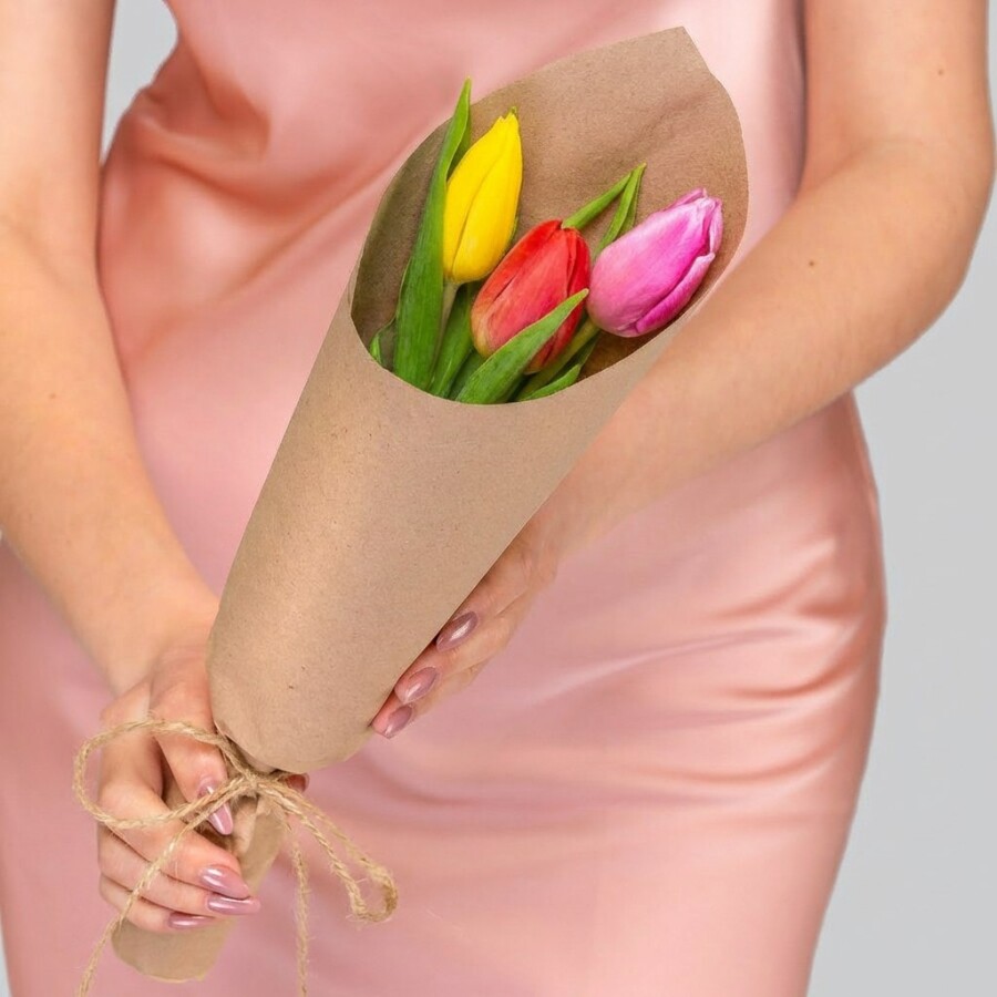 3 Разноцветных Тюльпана Микс в крафте под ленту (Корпоративный)