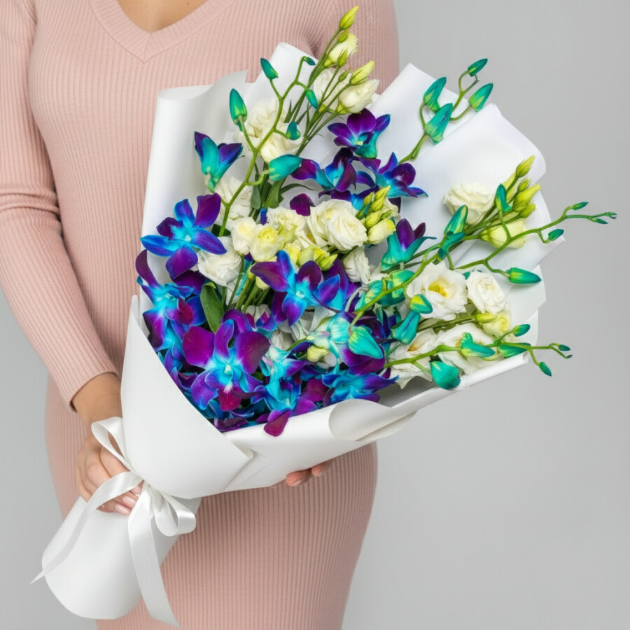 Букет "Эустома Белая и Синяя Орхидея Дендробиум"