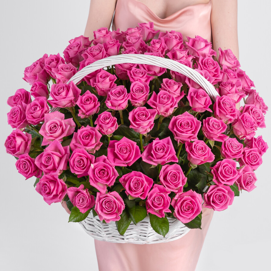101 Ярко-Розовая Роза Ревиваль в корзине