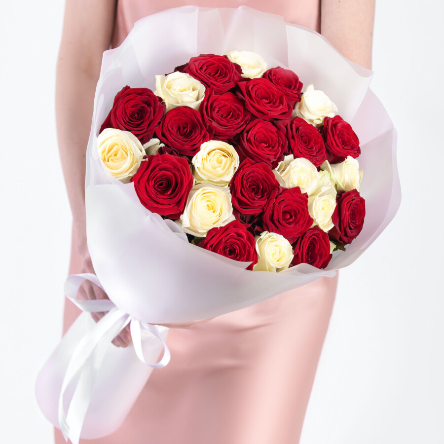 25 Красных и Белых Роз Ред Наоми и Аваланж (60 см)