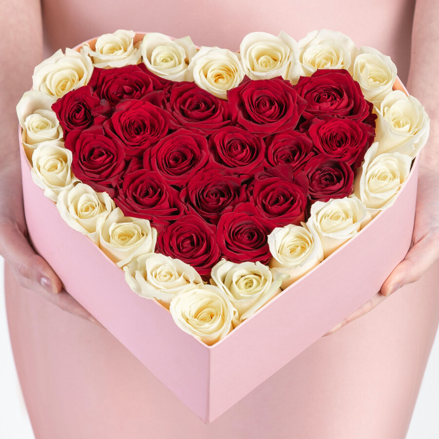 35 Белых и Красных Роз Аваланж и Ред Наоми в коробке сердце