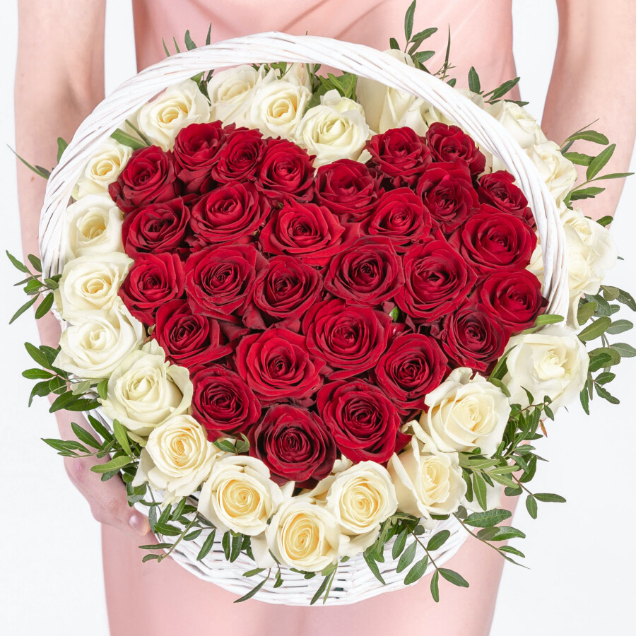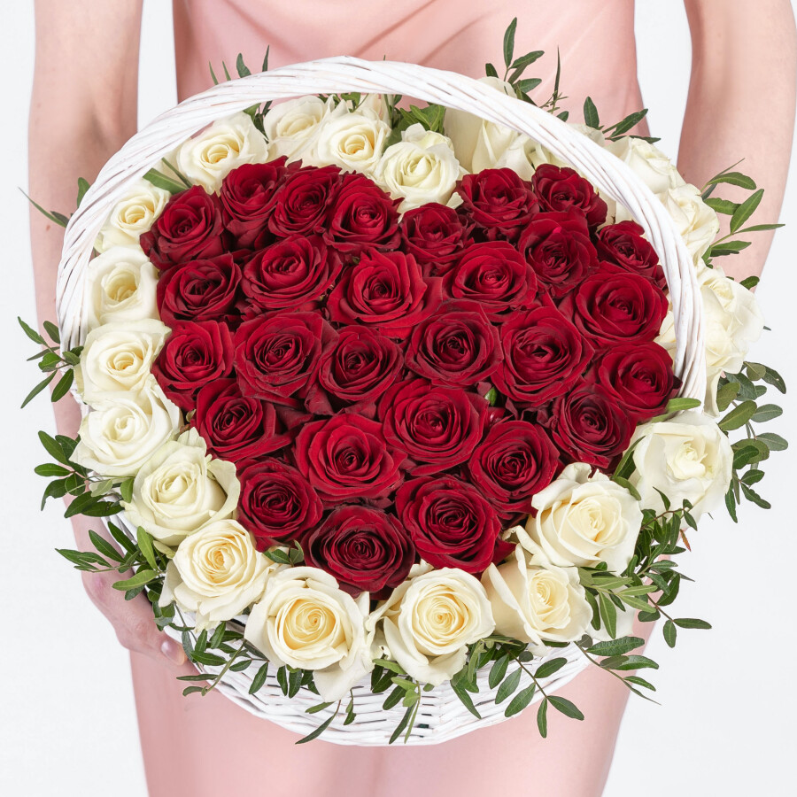 51 Белая и Красная Роза Аваланж и Ред Наоми сердце в корзине