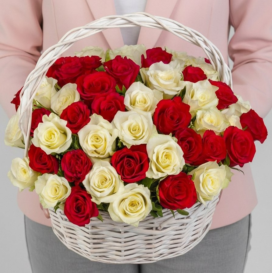 51 Красно-Белая Роза Ред Наоми и Аваланж в корзине