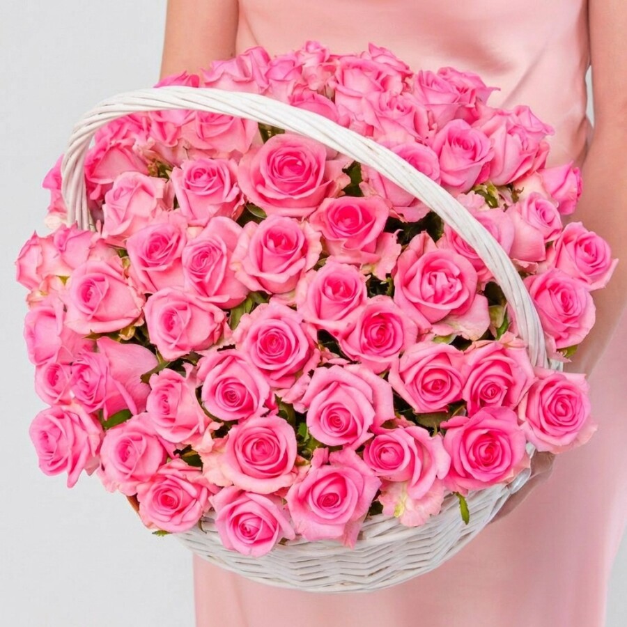 51 Ярко-Розовая Роза Ревиваль в корзине