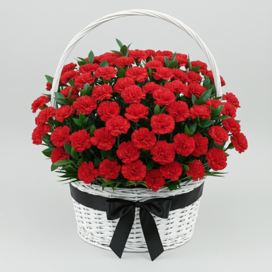 Траурная Композиция из 70 Красных Гвоздик в корзине