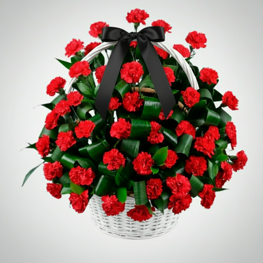 Траурная Композиция из 50 Красных Гвоздик и Аспидистры