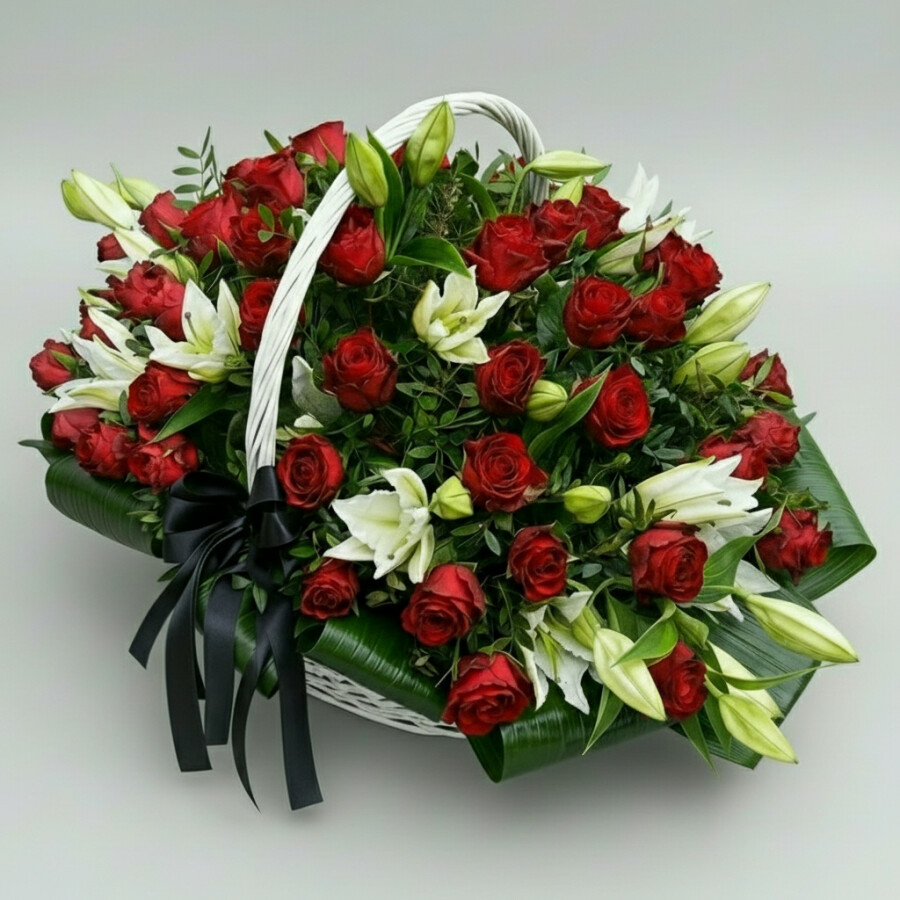 Траурная Композиция из 30 Красных Роз в корзине