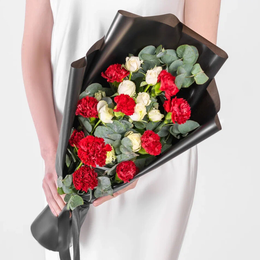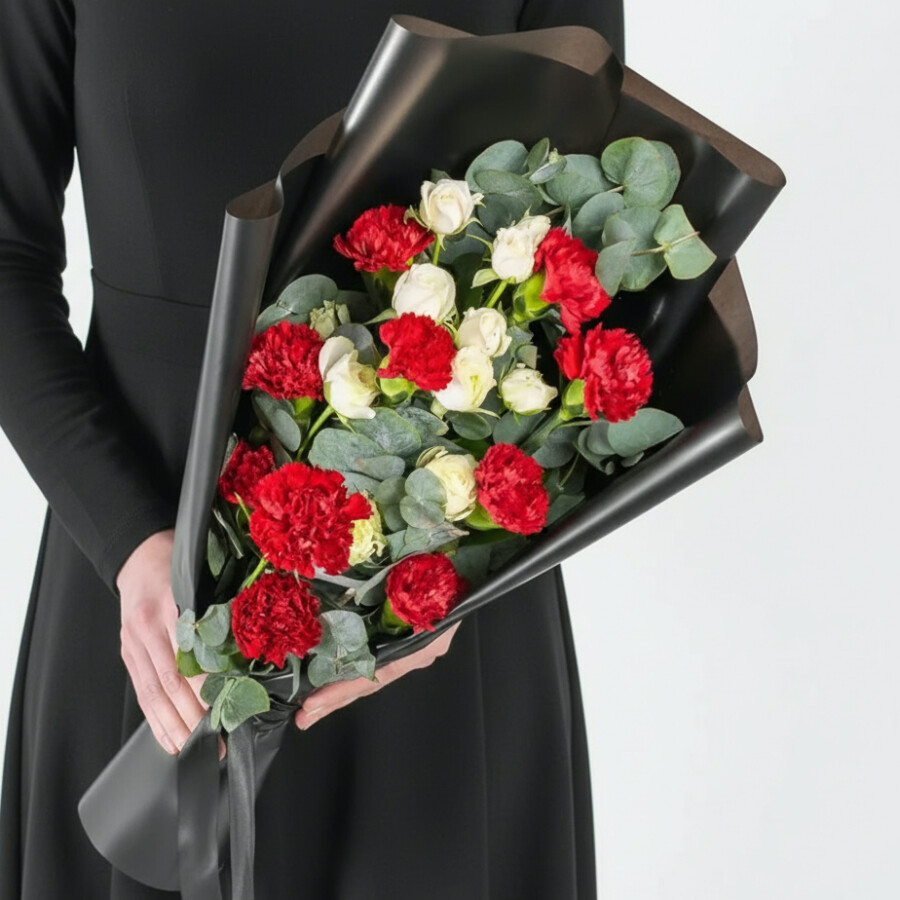 Траурный Букет из Красных Гвоздик и Белой Кустовой Розы