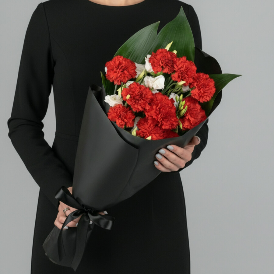 Траурный Букет из Эустомы Белой и Гвоздики Красной
