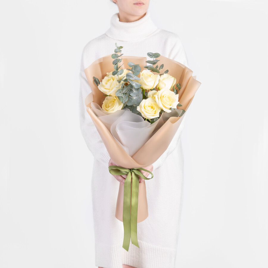 9 белых роз и эвкалипт